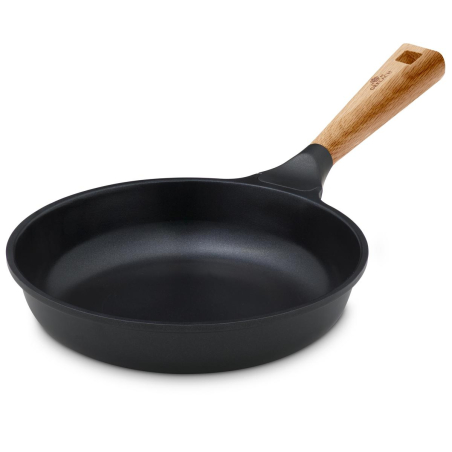 Grube dno z dyskiem ferromagnetycznym gwarantuje długotrwałą funkcjonalność oraz równomierną dystrybucję ciepła. Korzystnie wpływa na bardziej energooszczędne smażenie. Dodatkowo, umożliwia ono korzystanie z patelni na wszystkich rodzajach kuchenek: gazowej, elektrycznej, ceramicznej i indukcyjnej. Ergonomiczny uchwyt z drewna dębowego jest funkcjonalny oraz pewnie leży w mokrych dłoniach.
