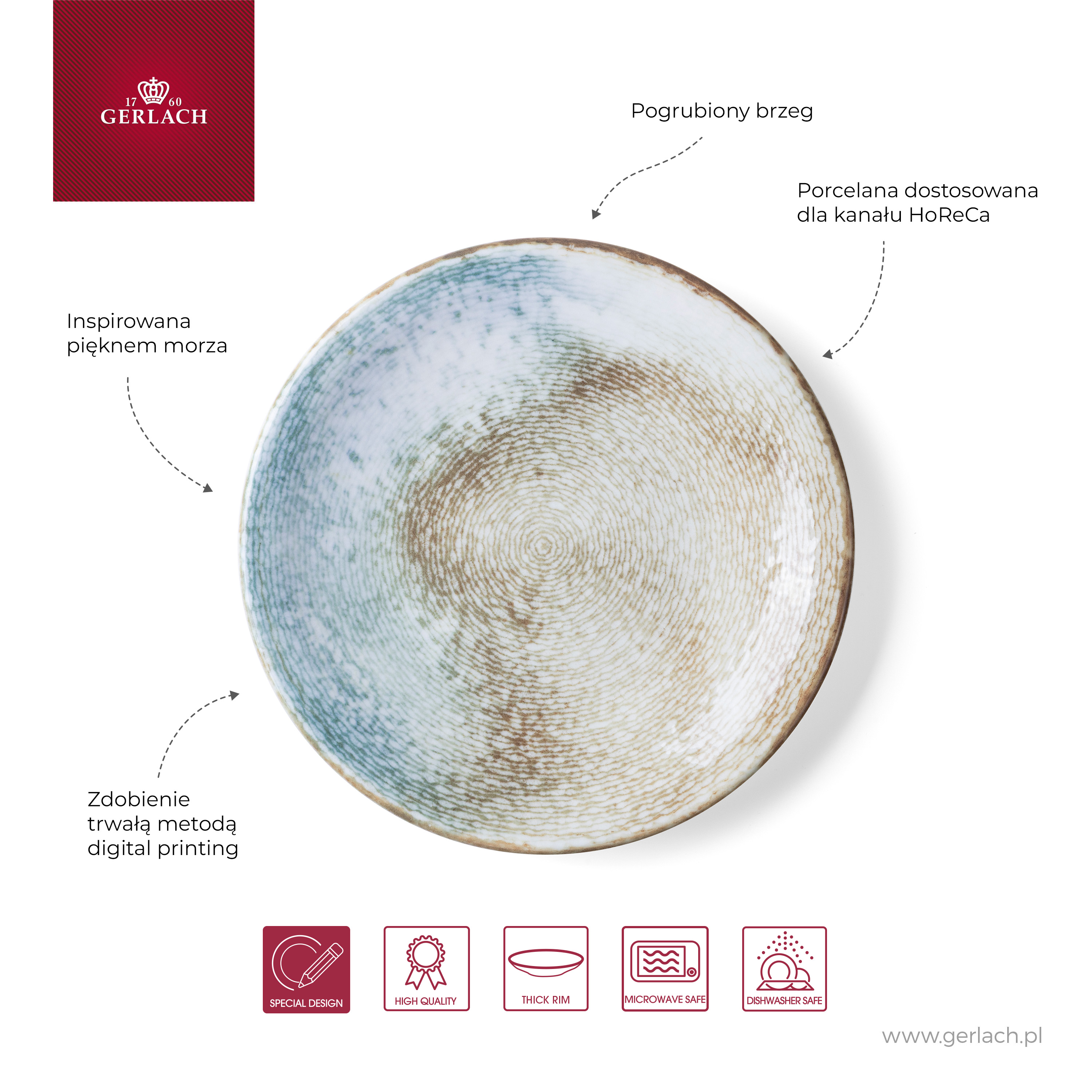 BALANCE TERRA GLOSSY to wysokiej jakości porcelana inspirowana pięknem morza. Subtelnie odwołuje się do faktury piasku i fal rozbijających się o plaże poprzez swoje zdobienie. To kolekcja idealna do serwowania dań lekkich, ryb, owoców morza, perfekcyjnie komponująca się nie tylko z nadmorskimi wnętrzami. Doskonale sprawdzi się do serwowania dań na prywatnych wydarzeniach, ale nie tylko. Zdobienie zostało wykonane nowoczesną metodą digital printing.