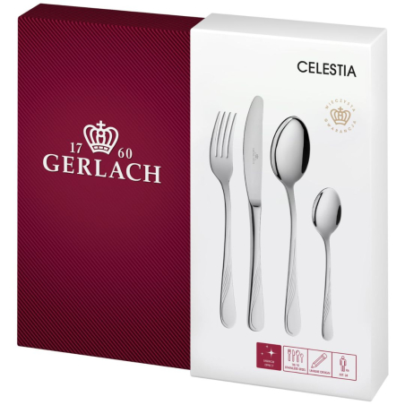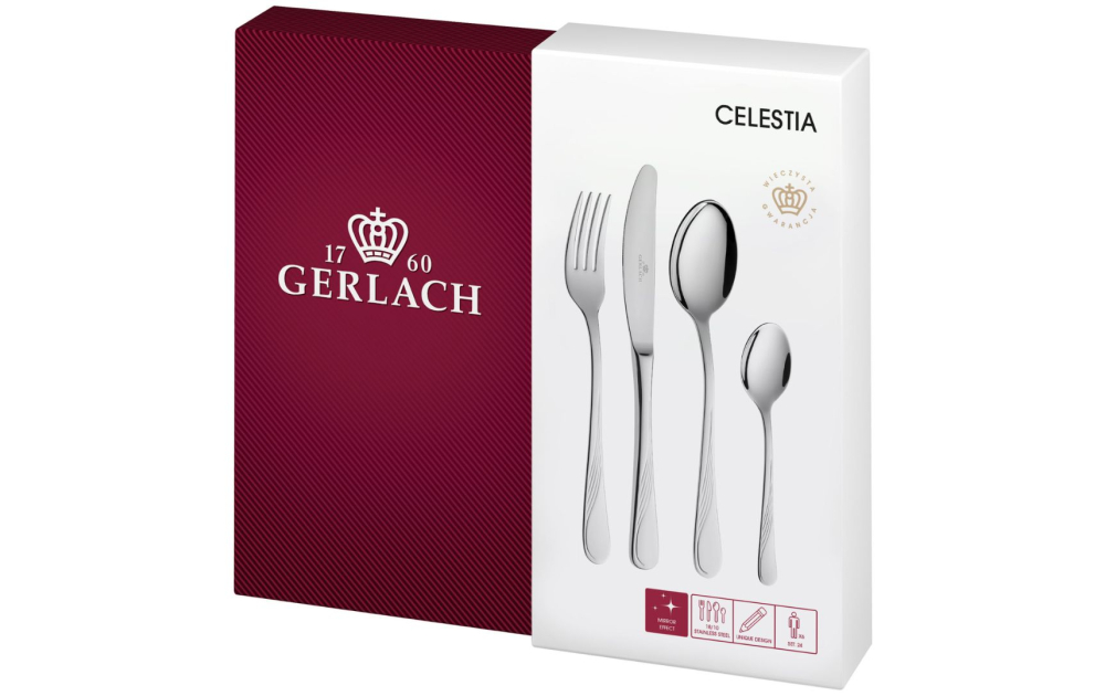Zestaw sztućców 24 szt. Celestia powstał z połączenia klasycznego wzornictwa z subtelnym ornamentem, który nadaje nożom, widelcom i łyżkom elegancki oraz gustowny wygląd. Tradycyjny kształt i forma sprawiają, że starannie zaprojektowane sztućce Celestia będą pięknym dodatkiem przy odświętnym obiedzie, jak i porannym śniadaniu. Ten niepowtarzalny design linii Celestia został zauważony i nagrodzony licznymi nagrodami i wyróżnieniami: Godło Teraz Polska, Medal Europejski 2000, Złoty Medal Międzynarodowych Targów Poznańskich, Dobry Wzór 1995. .